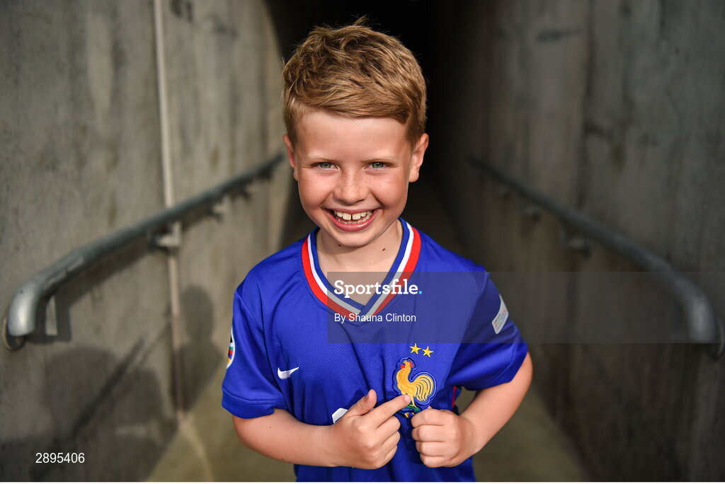28 July 2024; France supporter Louis White, aged eight, from Belfast in Ireland before the UEFA European U19 Championship finals match between Spain and France at the National Football Stadium at Windsor Park, Belfast. Photo by Shauna Clinton/Sportsfile