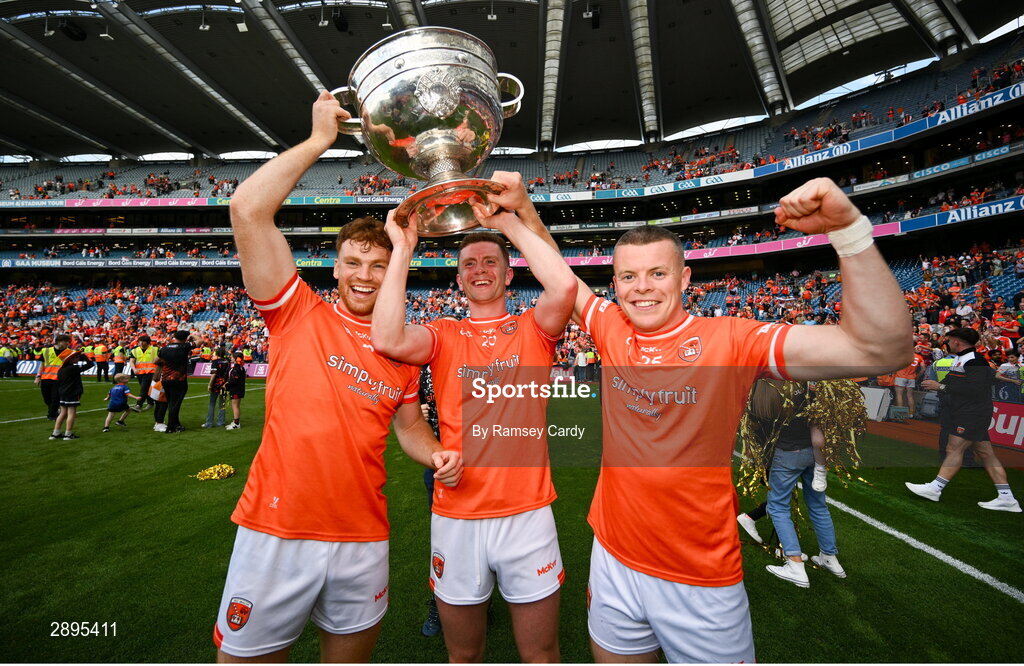 28 July 2024; Jason Duffy, left, Ross McQuillan, centre, and Aidan Nugent of Armagh lift the Sam Maguire Cup after the GAA Football All-Ireland Senior Championship Final match between Armagh and Galway at Croke Park in Dublin. Photo by Ramsey Cardy/Sportsfile