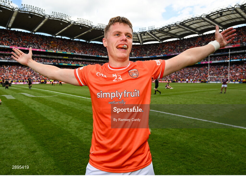28 July 2024; Oisin O'Neill of Armagh celebrates after the GAA Football All-Ireland Senior Championship Final match between Armagh and Galway at Croke Park in Dublin. Photo by Ramsey Cardy/Sportsfile
