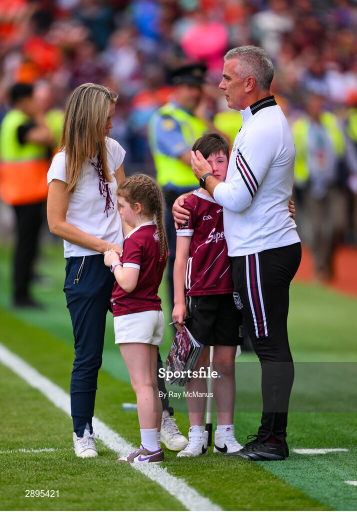 28 July 2024; Galway manager Padraic Joyce with his wife Tracey, daughter Jodie, and son Charlie after the GAA Football All-Ireland Senior Championship Final match between Armagh and Galway at Croke Park in Dublin. Photo by Ray McManus/Sportsfile