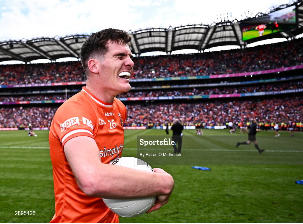 28 July 2024; Jarly Óg Burns of Armagh celebrates after his side's victory in the GAA Football All-Ireland Senior Championship Final match between Armagh and Galway at Croke Park in Dublin. Photo by Piaras Ó Mídheach/Sportsfile