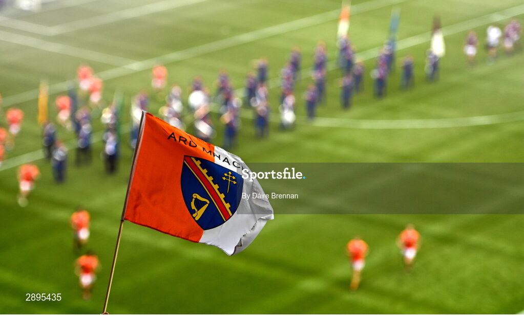 28 July 2024; An Armagh supporter waves a flag in the Upper Hogan Stand ahead of the GAA Football All-Ireland Senior Championship Final match between Armagh and Galway at Croke Park in Dublin. Photo by Daire Brennan/Sportsfile