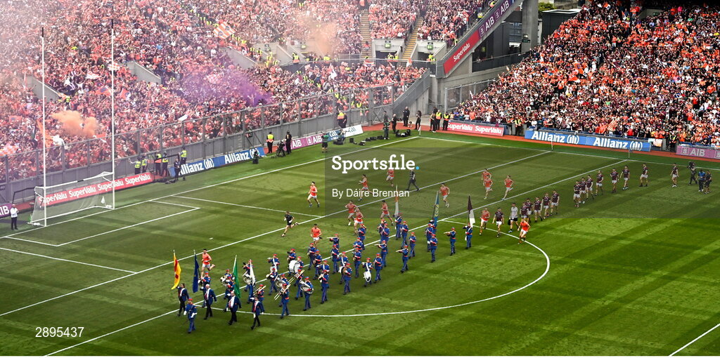 28 July 2024; The Armagh team break from the pre-match parade ahead of the GAA Football All-Ireland Senior Championship Final match between Armagh and Galway at Croke Park in Dublin. Photo by Daire Brennan/Sportsfile