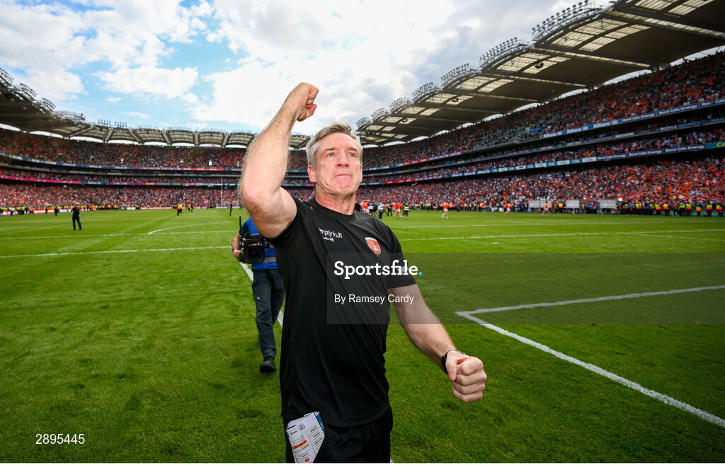 28 July 2024; Armagh manager Kieran McGeeney celebrates after the GAA Football All-Ireland Senior Championship Final match between Armagh and Galway at Croke Park in Dublin. Photo by Ramsey Cardy/Sportsfile