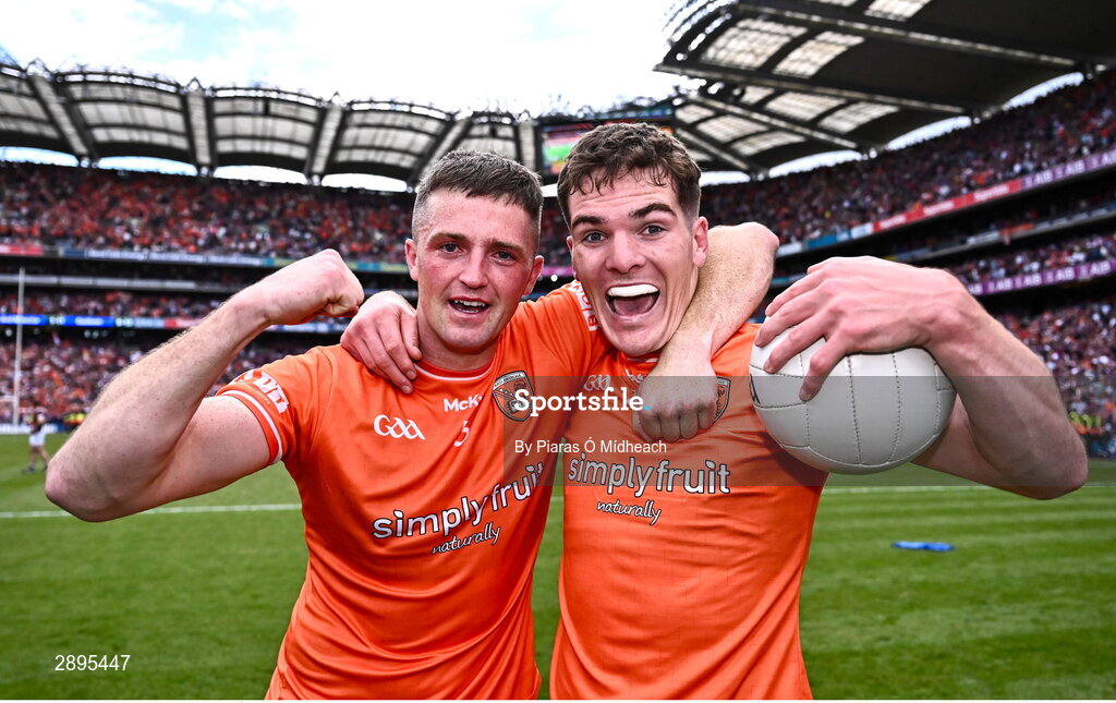 28 July 2024; Armagh players Connaire Mackin, left, and Jarly Óg Burns celebrate after their side's victory in the GAA Football All-Ireland Senior Championship Final match between Armagh and Galway at Croke Park in Dublin. Photo by Piaras Ó Mídheach/Sportsfile