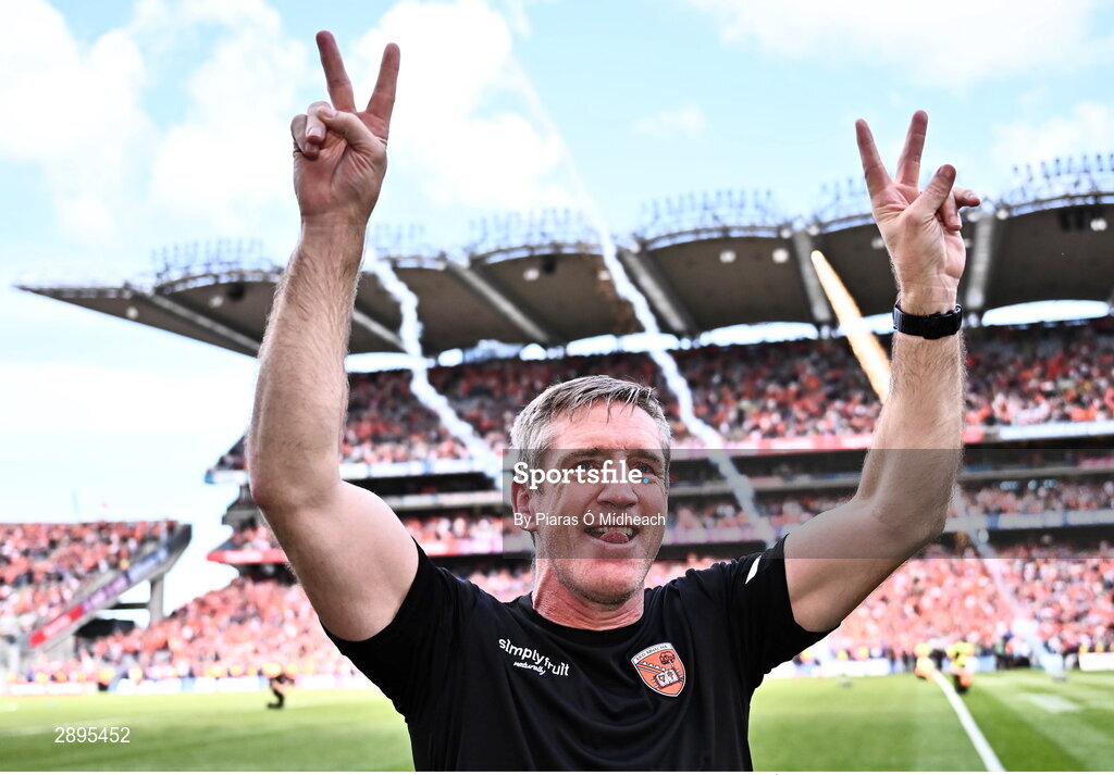28 July 2024; Armagh manager Kieran McGeeney celebrates after his side's victory in the GAA Football All-Ireland Senior Championship Final match between Armagh and Galway at Croke Park in Dublin. Photo by Piaras Ó Mídheach/Sportsfile