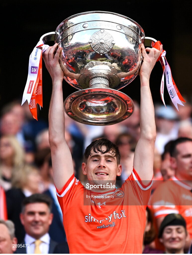 28 July 2024; Andrew Murnin of Armagh lifts the Sam Maguire cup after winning the GAA Football All-Ireland Senior Championship Final match between Armagh and Galway at Croke Park in Dublin. Photo by Ramsey Cardy/Sportsfile