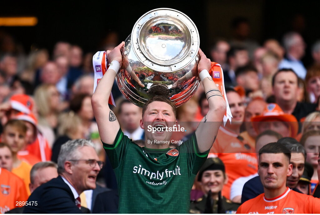 28 July 2024; Armagh goalkeeper Blaine Hughes lifts the Sam Maguire cup after winning the GAA Football All-Ireland Senior Championship Final match between Armagh and Galway at Croke Park in Dublin. Photo by Ramsey Cardy/Sportsfile