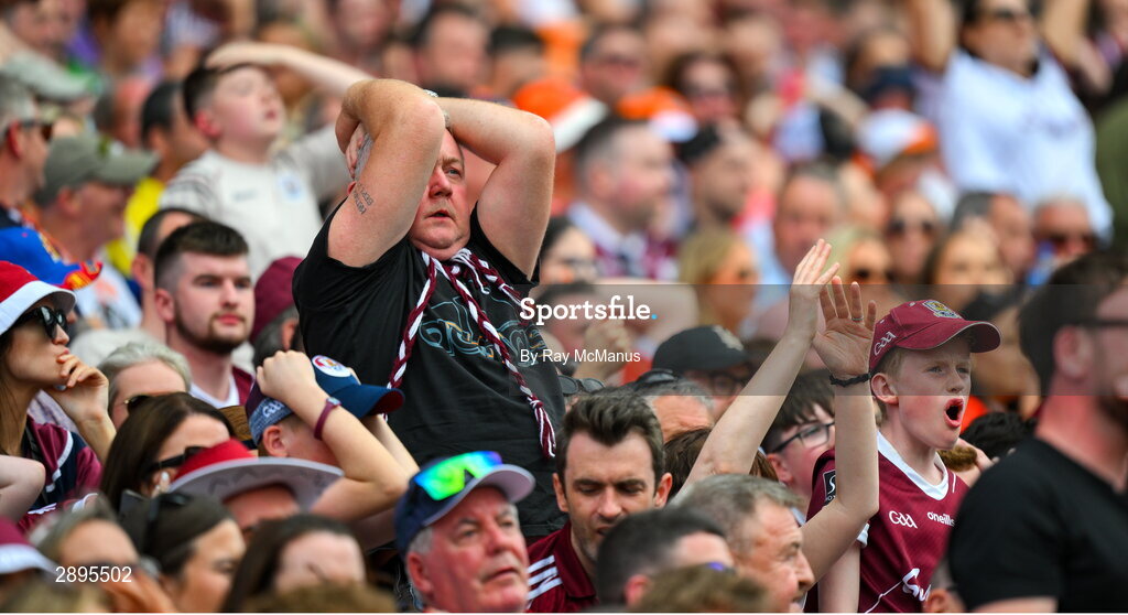28 July 2024; A Galway supporter, in the Cusack Stand, watches a late chance hit the post during the GAA Football All-Ireland Senior Championship Final match between Armagh and Galway at Croke Park in Dublin. Photo by Ray McManus/Sportsfile