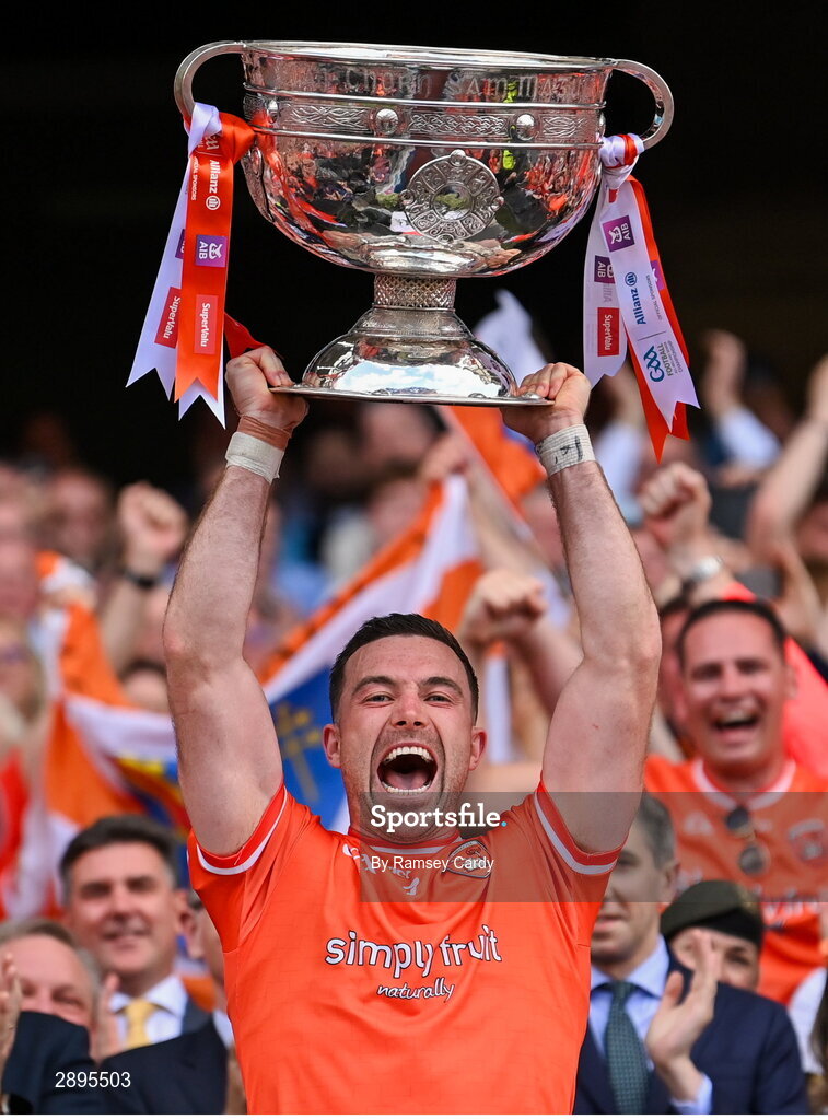 28 July 2024; Armagh captain Aidan Forker lifts the Sam Maguire Cup after winning the GAA Football All-Ireland Senior Championship Final match between Armagh and Galway at Croke Park in Dublin. Photo by Ramsey Cardy/Sportsfile
