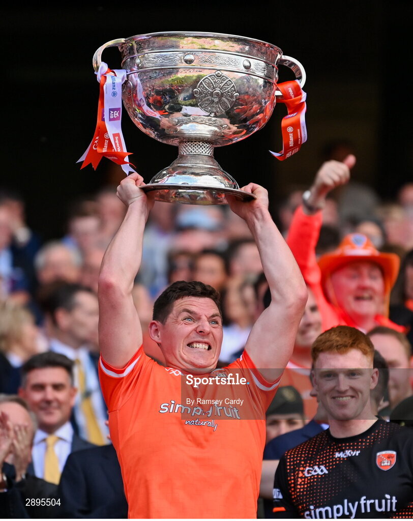 28 July 2024; Paddy Burns of Armagh lifts the Sam Maguire cup after winning the GAA Football All-Ireland Senior Championship Final match between Armagh and Galway at Croke Park in Dublin. Photo by Ramsey Cardy/Sportsfile