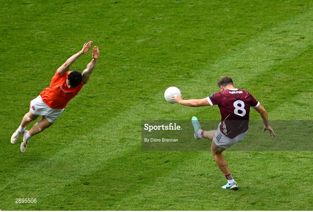 28 July 2024; Paul Conroy of Galway gets his shots away despite the efforts of Joe McElroy of Armagh during the GAA Football All-Ireland Senior Championship Final match between Armagh and Galway at Croke Park in Dublin. Photo by Daire Brennan/Sportsfile