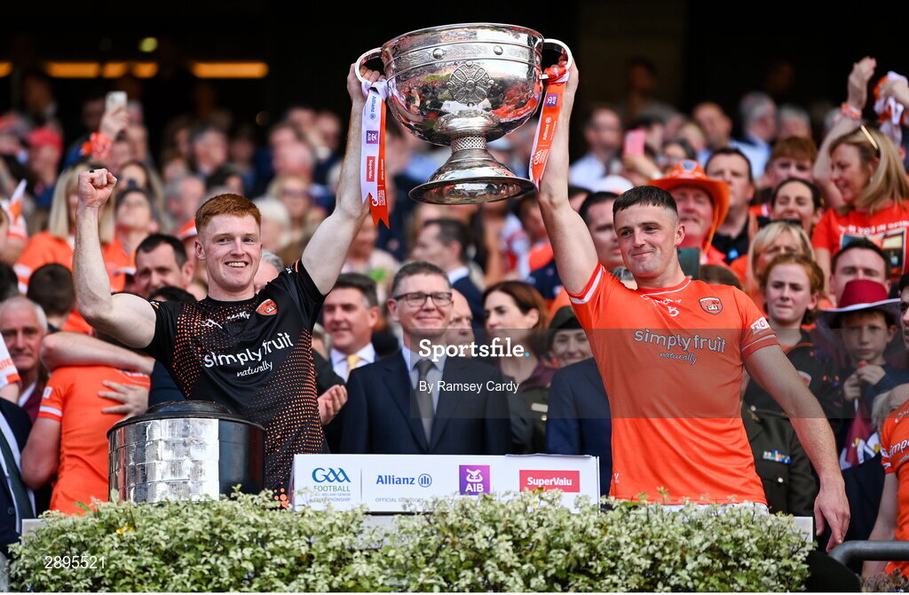 28 July 2024; Ciarán Mackin of Armagh lifts the Sam Maguire Cup after his side's victory in the GAA Football All-Ireland Senior Championship Final match between Armagh and Galway at Croke Park in Dublin.