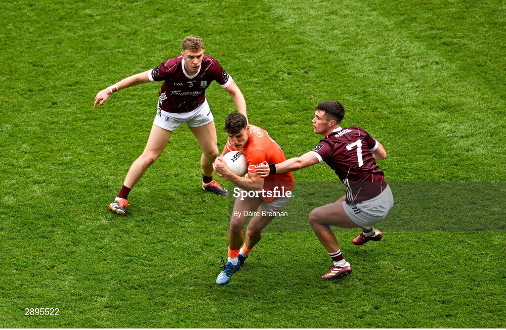 28 July 2024; Niall Grimley of Armagh in action against Dylan McHugh, left, and Séan Mulkerrin of Galway during the GAA Football All-Ireland Senior Championship Final match between Armagh and Galway at Croke Park in Dublin. Photo by Daire Brennan/Sportsfile