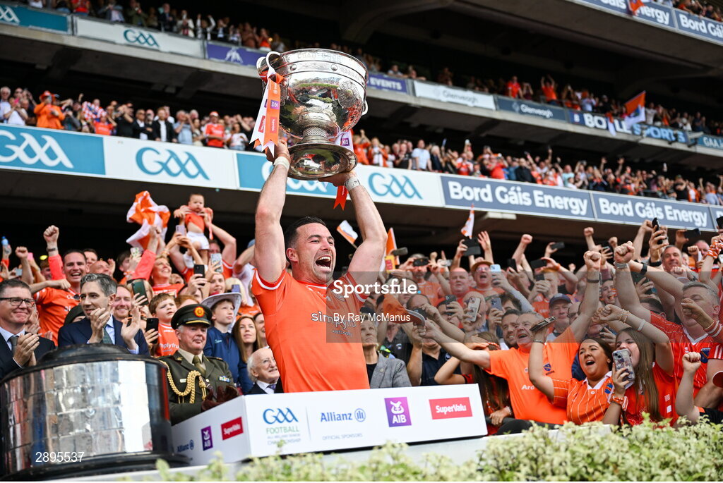 28 July 2024; Armagh captain Aidan Forker lifts the Sam Maguire Cup after their side's victory in the GAA Football All-Ireland Senior Championship Final match between Armagh and Galway at Croke Park in Dublin. Photo by Ray McManus/Sportsfile