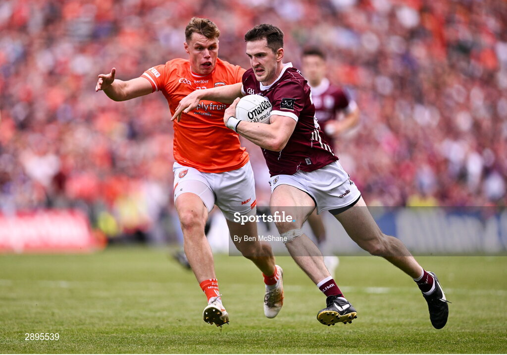 28 July 2024; Cein Darcy of Galway in action against Oisin O'Neill of Armagh during the GAA Football All-Ireland Senior Championship Final match between Armagh and Galway at Croke Park in Dublin. Photo by Ben McShane/Sportsfile