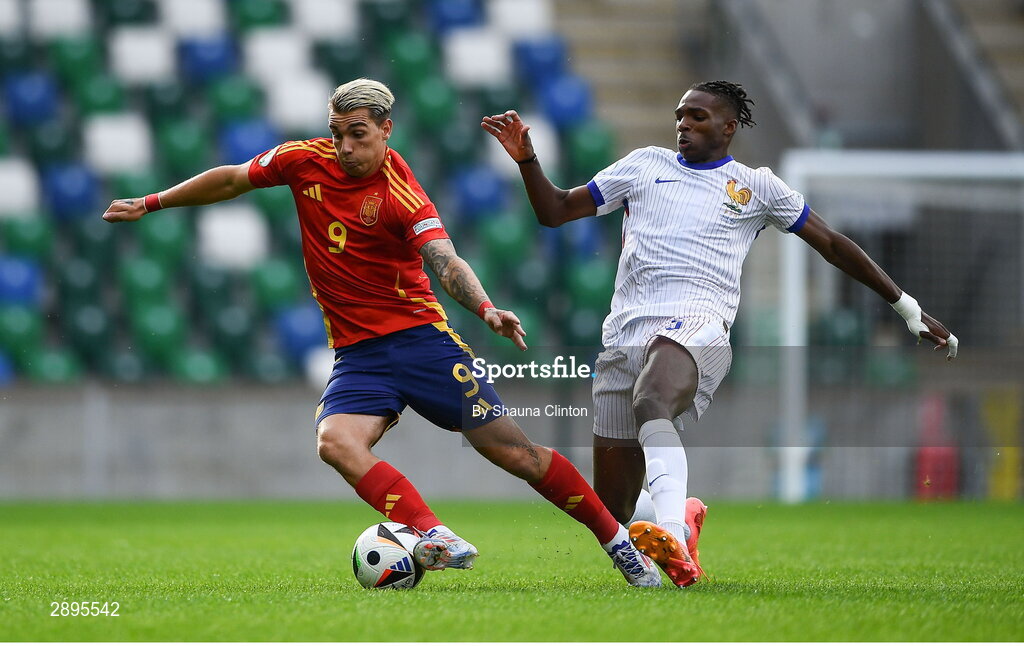28 July 2024; Iker Bravo of Spain in action against Jérémy Jacquet of France during the UEFA European U19 Championship finals match between Spain and France at the National Football Stadium at Windsor Park, Belfast. Photo by Shauna Clinton/Sportsfile