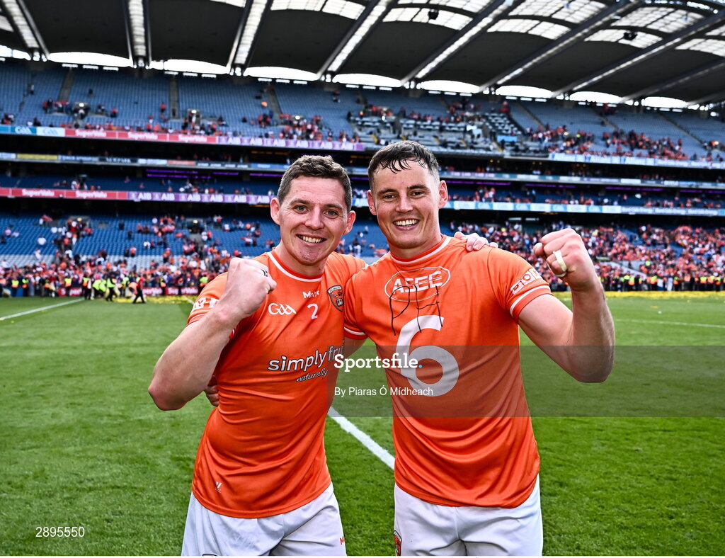 28 July 2024; Armagh players Paddy Burns, left, and Tiernan Kelly after his side's victory in the GAA Football All-Ireland Senior Championship Final match between Armagh and Galway at Croke Park in Dublin. Photo by Piaras Ó Mídheach/Sportsfile