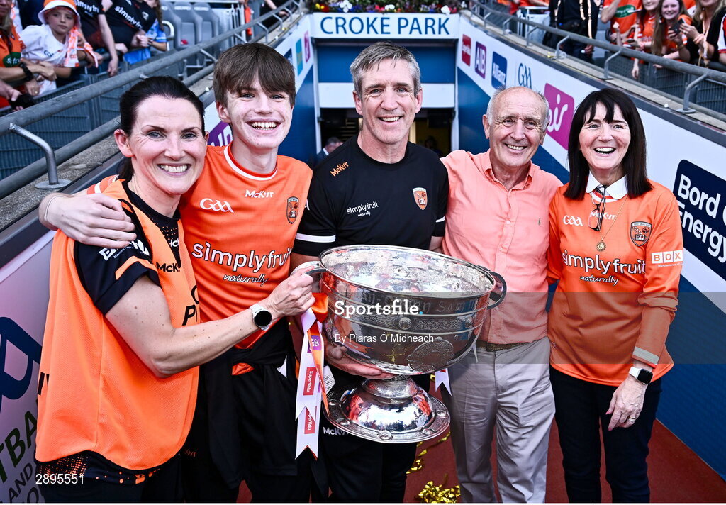 28 July 2024; Armagh manager Kieran McGeeney holds the Sam Maguire Cup as he celebrates with, from left, his wife Maura, his son Cian, and his parents Pat and Brigid after the GAA Football All-Ireland Senior Championship Final match between Armagh and Galway at Croke Park in Dublin. Photo by Piaras Ó Mídheach/Sportsfile