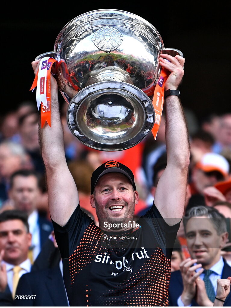 28 July 2024; Armagh selector Ciarán McKeever lifts the Sam Maguire cup after winning the GAA Football All-Ireland Senior Championship Final match between Armagh and Galway at Croke Park in Dublin. Photo by Ramsey Cardy/Sportsfile