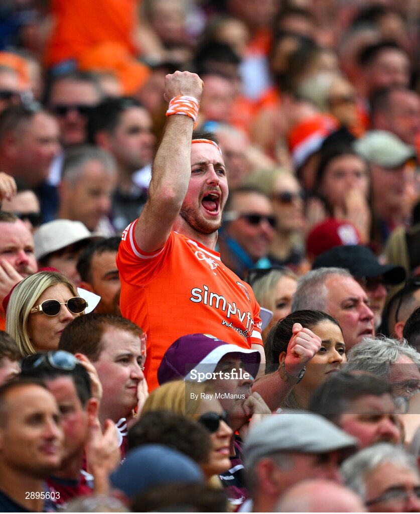 28 July 2024; An Armagh supporter, in the Cusack Stand, celebrates a score during the GAA Football All-Ireland Senior Championship Final match between Armagh and Galway at Croke Park in Dublin. Photo by Ray McManus/Sportsfile