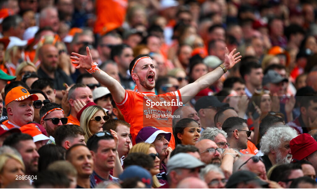 28 July 2024; An Armagh supporter, in the Cusack Stand, celebrates a score during the GAA Football All-Ireland Senior Championship Final match between Armagh and Galway at Croke Park in Dublin. Photo by Ray McManus/Sportsfile