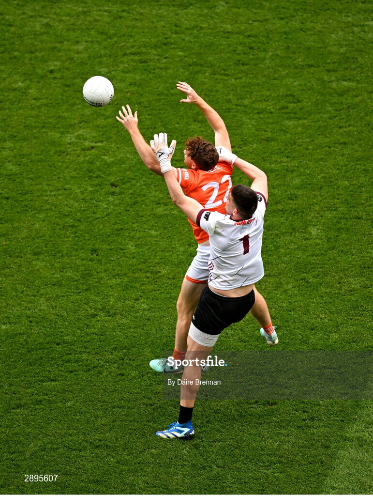 28 July 2024; Jason Duffy of Armagh in action against Galway goalkeeper Connor Gleeson during the GAA Football All-Ireland Senior Championship Final match between Armagh and Galway at Croke Park in Dublin. Photo by Daire Brennan/Sportsfile
