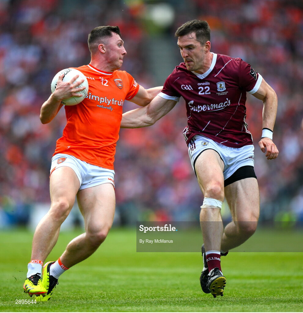 28 July 2024; Oisin Conaty of Armagh is tackled by Cein Darcy of Galway during the GAA Football All-Ireland Senior Championship Final match between Armagh and Galway at Croke Park in Dublin. Photo by Ray McManus/Sportsfile