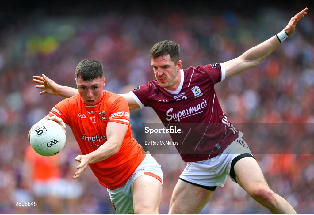 28 July 2024; Oisin Conaty of Armagh is tackled by Cein Darcy of Galway during the GAA Football All-Ireland Senior Championship Final match between Armagh and Galway at Croke Park in Dublin. Photo by Ray McManus/Sportsfile