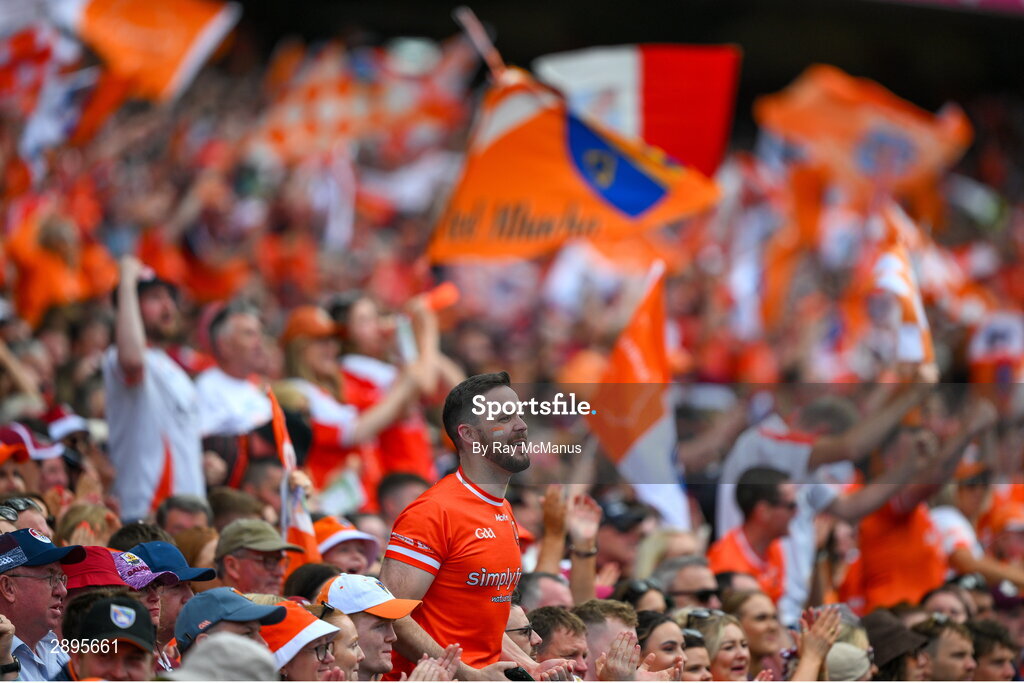 28 July 2024; Armagh supporters, in the Cusack Stand, celebrate a score during the GAA Football All-Ireland Senior Championship Final match between Armagh and Galway at Croke Park in Dublin. Photo by Ray McManus/Sportsfile