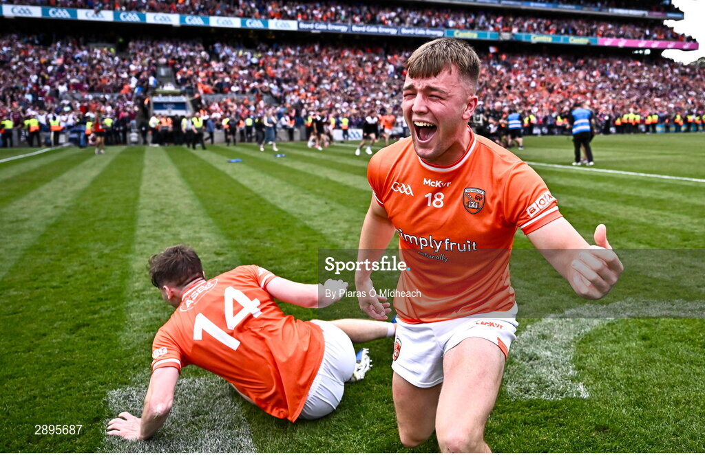 28 July 2024; Armagh players Peter McGrane, right, and Andrew Murnin celebrate after their side's victory in the GAA Football All-Ireland Senior Championship Final match between Armagh and Galway at Croke Park in Dublin. Photo by Piaras Ó Mídheach/Sportsfile