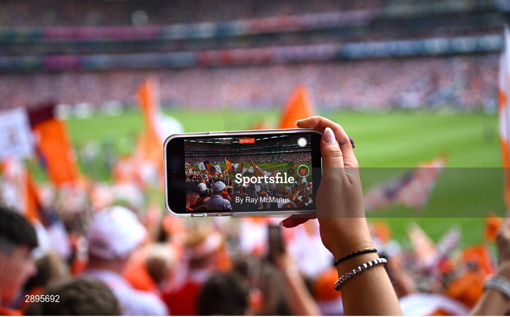 28 July 2024; A supporters records a general view of Croke Park as the two teams parade behind the Artane Band ahead the GAA Football All-Ireland Senior Championship Final match between Armagh and Galway at Croke Park in Dublin. Photo by Ray McManus/Sportsfile