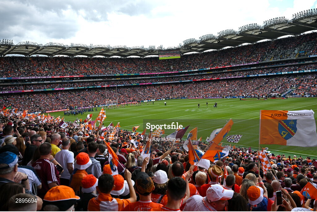 28 July 2024; A general view of Croke Park as the two teams parade behind the Artane Band ahead the GAA Football All-Ireland Senior Championship Final match between Armagh and Galway at Croke Park in Dublin. Photo by Ray McManus/Sportsfile