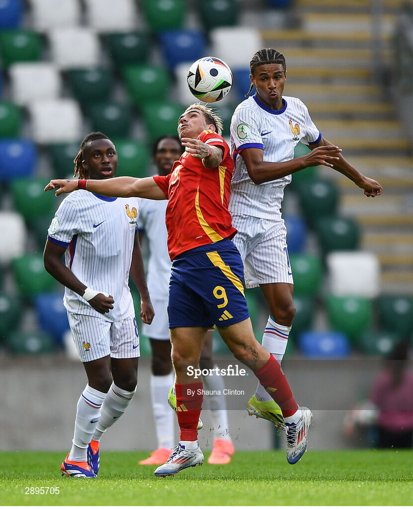 28 July 2024; Iker Bravo of Spain in action against Jean-Mattéo Bahoya of France during the UEFA European U19 Championship finals match between Spain and France at the National Football Stadium at Windsor Park, Belfast. Photo by Shauna Clinton/Sportsfile