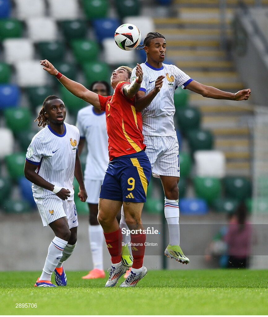 28 July 2024; Iker Bravo of Spain in action against Jean-Mattéo Bahoya of France during the UEFA European U19 Championship finals match between Spain and France at the National Football Stadium at Windsor Park, Belfast. Photo by Shauna Clinton/Sportsfile