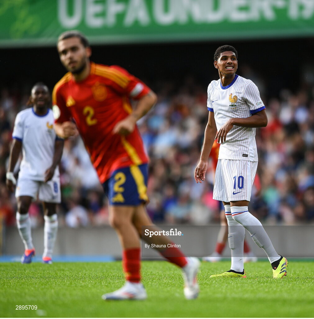 28 July 2024; Dehmaine Tabibou Assoumani of France reacts to a missed shot on goal during the UEFA European U19 Championship finals match between Spain and France at the National Football Stadium at Windsor Park, Belfast. Photo by Shauna Clinton/Sportsfile