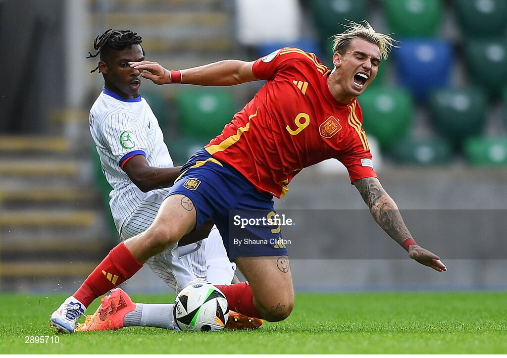 28 July 2024; Iker Bravo of Spain is tackled by Jérémy Jacquet of France during the UEFA European U19 Championship finals match between Spain and France at the National Football Stadium at Windsor Park, Belfast. Photo by Shauna Clinton/Sportsfile
