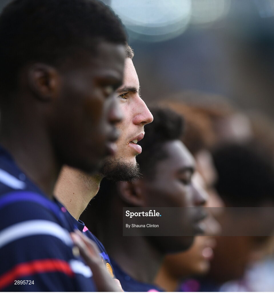 28 July 2024; France players, including Elyaz Zidane, second from left, sing the national anthem before the UEFA European U19 Championship finals match between Spain and France at the National Football Stadium at Windsor Park, Belfast. Photo by Shauna Clinton/Sportsfile