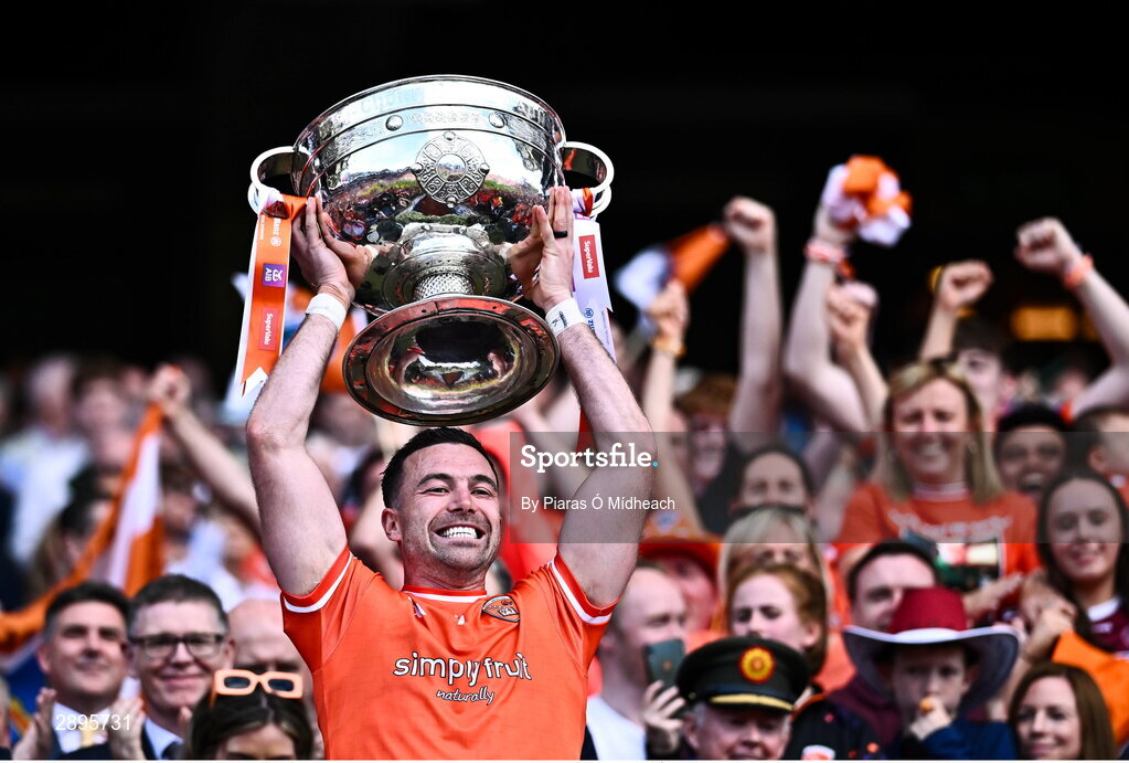 28 July 2024; Armagh captain Aidan Forker lifts the Sam Maguire Cup after his side's victory in the GAA Football All-Ireland Senior Championship Final match between Armagh and Galway at Croke Park in Dublin. Photo by Piaras Ó Mídheach/Sportsfile
