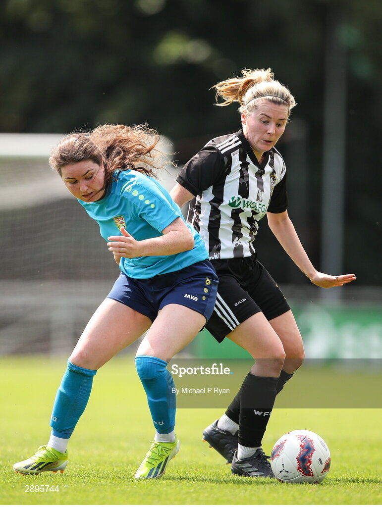 28 July 2024; Caolan Carroll of Whitehall Rangers in action against Sarah Ryan of Terenure Rangers during the FAI Women's Amateur Cup Final 2024 match between Whitehall Rangers and Terenure Rangers at UCD Bowl in Dublin. Photo by Michael P Ryan/Sportsfile