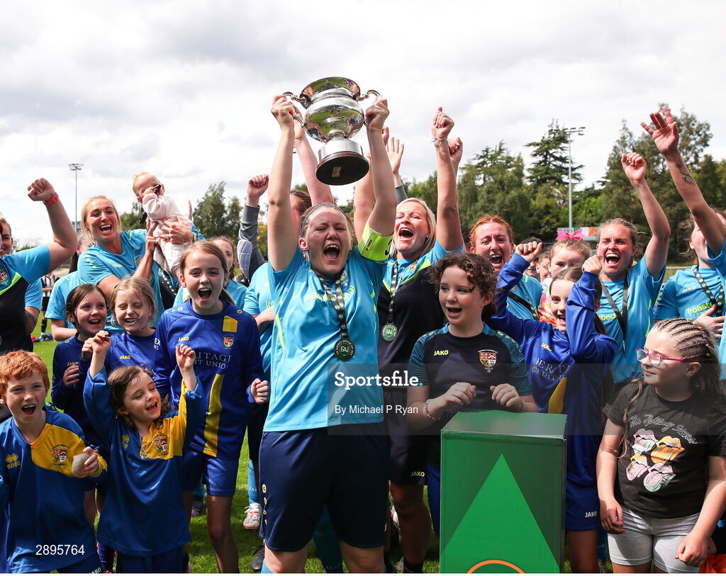 28 July 2024; Terenure Rangers captain Niamh Carroll lifts the cup after the FAI Women's Amateur Cup Final 2024 match between Whitehall Rangers and Terenure Rangers at UCD Bowl in Dublin. Photo by Michael P Ryan/Sportsfile