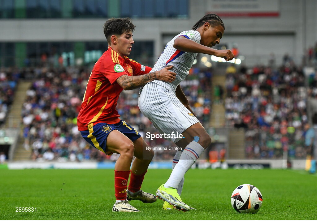 28 July 2024; Jean-Mattéo Bahoya of France is tackled by Dani Rodriguez of Spain during the UEFA European U19 Championship finals match between Spain and France at the National Football Stadium at Windsor Park, Belfast. Photo by Shauna Clinton/Sportsfile
