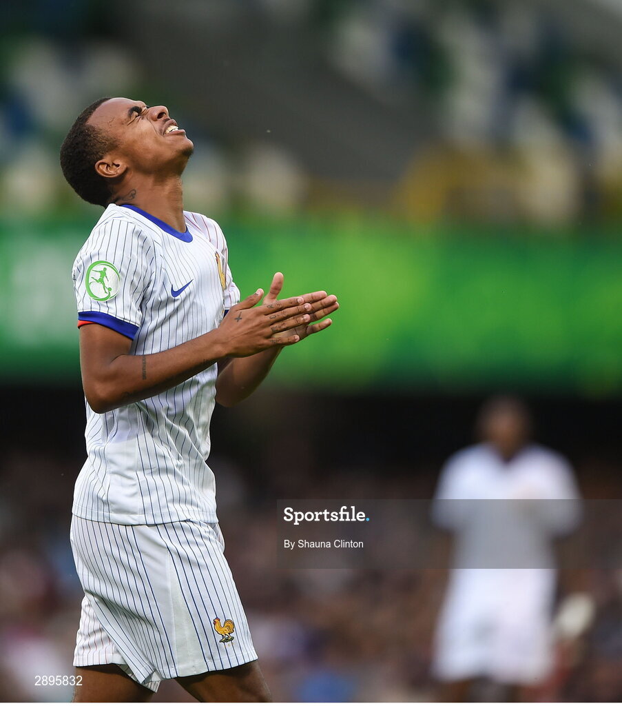 28 July 2024; Eli Junior Kroupi of France reacts to a missed shot on goal during the UEFA European U19 Championship finals match between Spain and France at the National Football Stadium at Windsor Park, Belfast. Photo by Shauna Clinton/Sportsfile