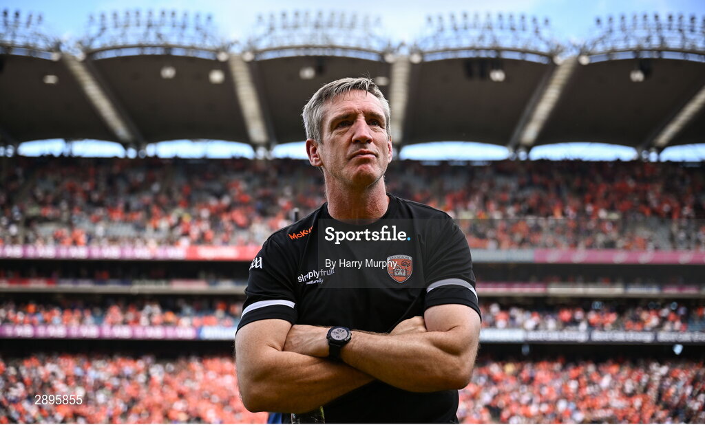 28 July 2024; Armagh manager Kieran McGeeney watches the trophy presentation after his side's victory in the GAA Football All-Ireland Senior Championship Final match between Armagh and Galway at Croke Park in Dublin. Photo by Harry Murphy/Sportsfile
