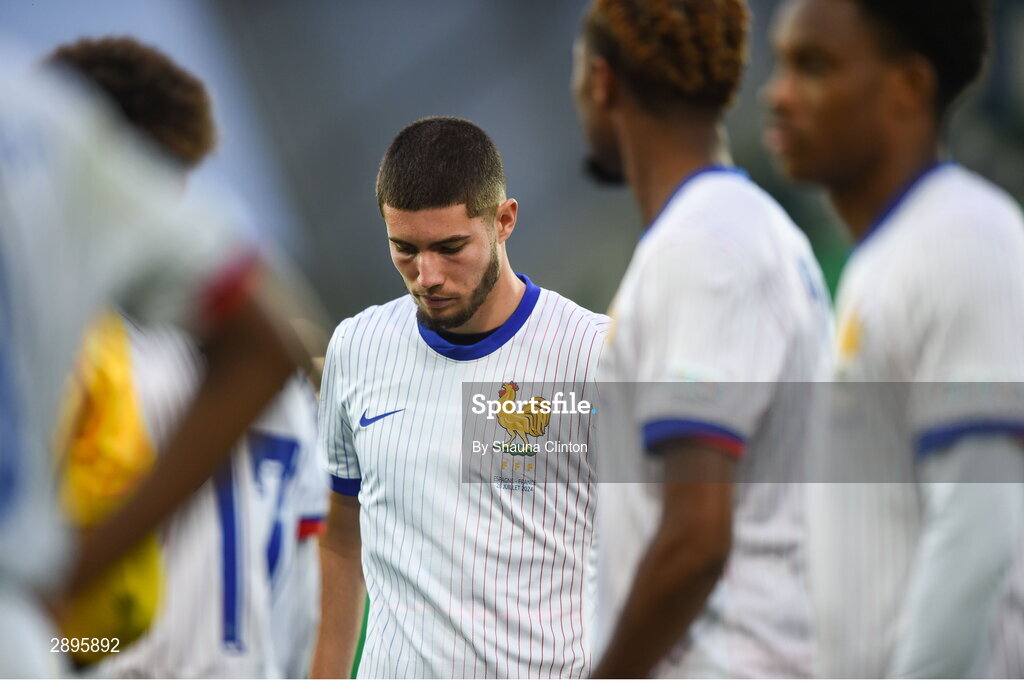28 July 2024; Elyaz Zidane of France reacts after his side's defeat in the UEFA European U19 Championship finals match between Spain and France at the National Football Stadium at Windsor Park, Belfast. Photo by Shauna Clinton/Sportsfile