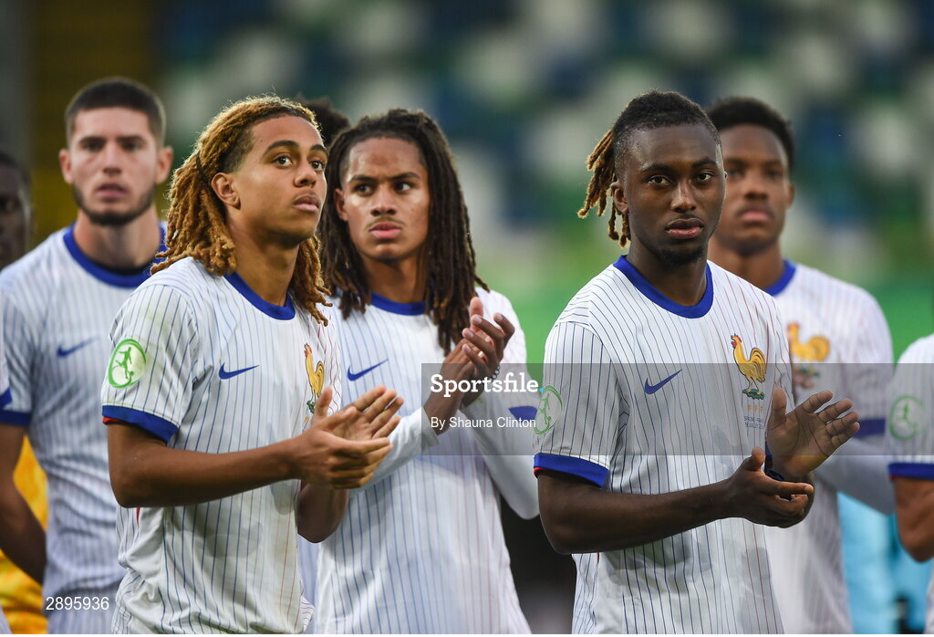 28 July 2024; France players Saimon Nadélia Bouabré, left, and Valentin Atangana after their side's defeat in the UEFA European U19 Championship finals match between Spain and France at the National Football Stadium at Windsor Park, Belfast. Photo by Shauna Clinton/Sportsfile