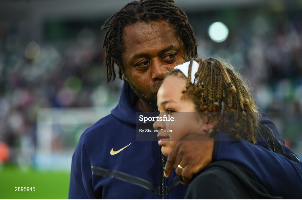 28 July 2024; France manager Bernard Diomede and his son after his side's defeat in the UEFA European U19 Championship finals match between Spain and France at the National Football Stadium at Windsor Park, Belfast. Photo by Shauna Clinton/Sportsfile