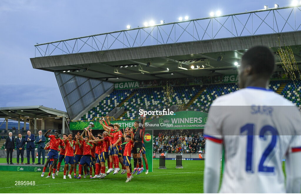 28 July 2024; A dejected Mamadou Sarr of France looks on as Spain players celebrate their victory in the UEFA European U19 Championship finals match between Spain and France at the National Football Stadium at Windsor Park, Belfast. Photo by Shauna Clinton/Sportsfile