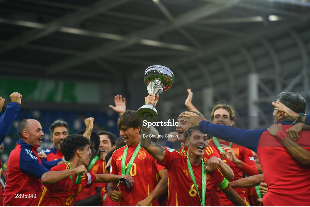 28 July 2024; Spain players celebrate after their side's victory in the UEFA European U19 Championship finals match between Spain and France at the National Football Stadium at Windsor Park, Belfast. Photo by Shauna Clinton/Sportsfile