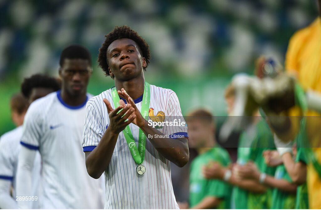 28 July 2024; Ayman Aiki of France dejected after his side's defeat in the UEFA European U19 Championship finals match between Spain and France at the National Football Stadium at Windsor Park, Belfast. Photo by Shauna Clinton/Sportsfile